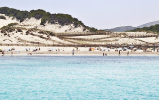 Con 300 metros de longitud y 130 metros de anchura, destaca por su fina arena blanca, sus aguas cristalinas y su impresionante sistema de dunas protegidas. Una extensa pasarela de madera atraviesa la playa, permitiendo disfrutar del entorno sin dañar el delicado ecosistema.